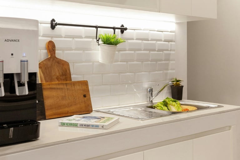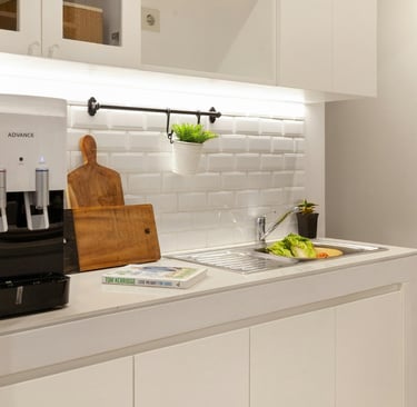To keep the space feeling cozy, add natural textures such as wooden cutting boards, woven baskets, or potted herbs. These small touches soften the modern aesthetic and make your kitchen not only a place for cooking but also a welcoming space for gathering and inspiration.